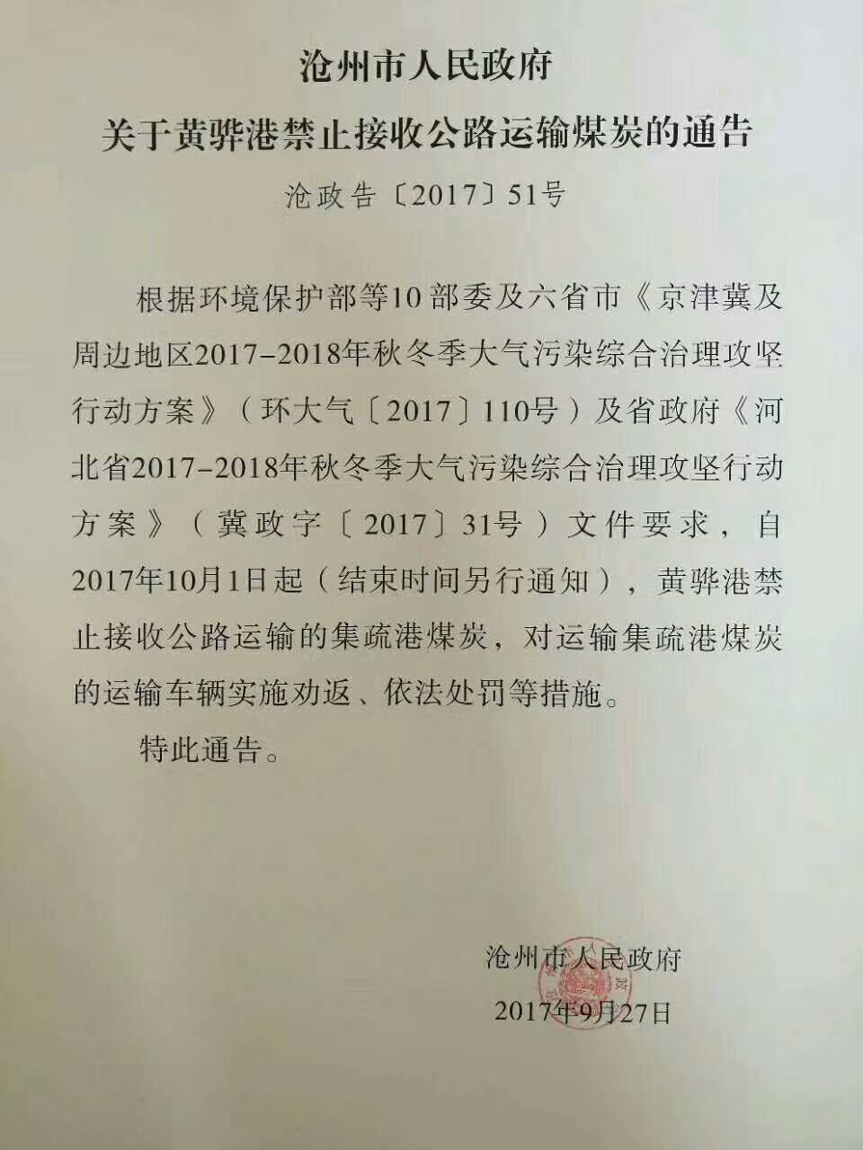 9.27沧州政府关于黄骅港禁止接收所有汽运煤文件 3000万